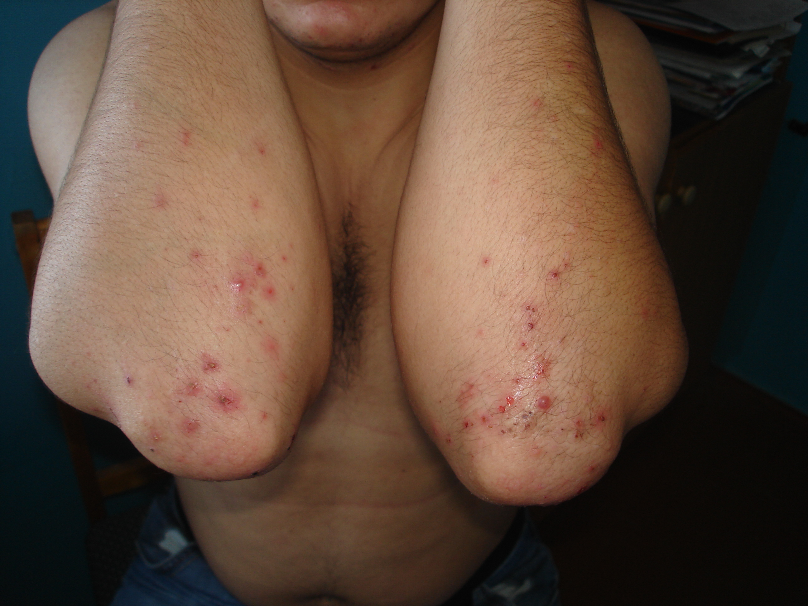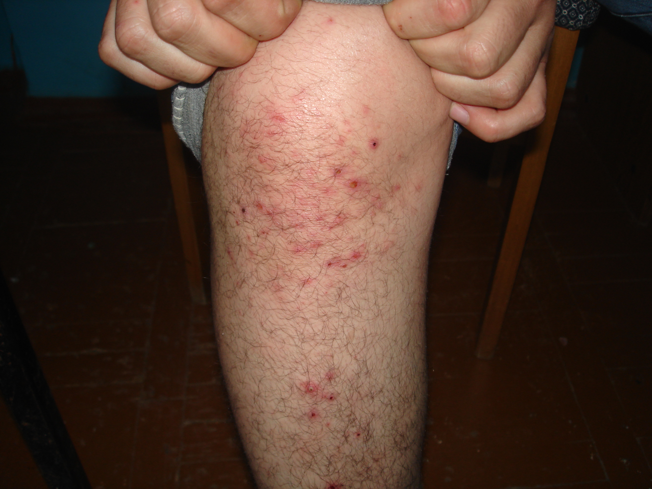 Представлены клинические наблюдения чесотки у ВИЧ-инфицированных мужчин 40 и 24 лет, которая атипично проявлялась.  Паразитарное заболевание у обоих носило распространенный характер с вовлечением в процесс волосистой части головы и лица. Причем типичные чесоточные ходы идентифицировать ни у кого не удалось. Эффлоресценции манифестировали с ярко выраженным экссудативным компонентом: везикулы, папулы, уртикароподобные экзантемы и папуловезикулы. Одному пациенту, страдающему уже более двух месяцев, ошибочно была выставлена распространённая экзема и без эффекта проведена десенсибилизирующая терапия. В тоже время местное противоскабиозное лечение у него вызвало усиление инфильтрации в основании элементов кожи и их отечность. Тем не менее, после курса наружной терапии экзантемы постепенно регрессировали, зуд исчез.  У второго больного в течение недели после местной терапии экзантемы также регрессировали, но зуд эпизодически появлялся один-два раза в сутки в отдельные дни. Таким образом практикующим дерматологам у ВИЧ-инфицированных пациентов с зудящими дерматозами (экземой, крапивницей, почесухой) необходимо проводить их дифференциальную диагностику  с чесоткой.